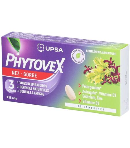 Complément alimentaire à utiliser dans le cadre d’une alimentation variée, équilibrée et d’un mode de vie sain.Certaines périodes sont propices aux inconforts respiratoires. Elles s’accompagnent souvent d’une baisse de forme générale et peuvent impacter votre quotidien. Dans ces moments-là, le complément alimentaire PHYTOVEX® COMPRIMÉS NEZ GORGE est votre allié grâce à sa formule triple action :1/ Le Pélargonium participe à apaiser les voies respiratoires et la gorge en cas de picotements.2/ L’Astragale soutient les défenses naturelles. La Vitamine D3, le Sélénium et le Zinc contribuent au maintien du bon fonctionnement du système immunitaire. Le Sélénium et le Zinc participent également à protéger les cellules contre le stress oxydatif.3/ La Vitamine B3 (la niacine) contribue à réduire la fatigue et à un métabolisme énergétique normal.Sans gluten, sans lactoseIngrédientsAgents de charge : cellulose et phosphates de calcium, extrait sec de racine d’Astragale (Astragalus membranaceus), extrait sec de racine de Pélargonium (Pelargonium sidoides), stabilisant : carboxyméthylcellulose sodique réticulée, nicotinamide, antiagglomérants : sels de magnésium d'acides gras et dioxyde de silicium [nano], citrate de zinc, L-sélénométhionine, cholécalciférol.Valeurs nutritionnelles Dosage pour 1 comprimé VNR* Dosage pour 2 comprimés VNR* Extrait sec d'Astragale Equivalent racine séchée 500 mg 2000 mg / 1000 mg 4000 mg / Extrait sec de PélargoniumEquivalent racine séchée 43 mg 172 mg / 86 mg 344 mg / Vitamine B3 (nicotinamide) 20 mg 125% 40 mg 250% Zinc 7,5 mg 75% 15 mg 150% Sélénium 50 µg 91% 100 µg 182% Vitamine D3 (cholécalciférol) 10 µg 200% 20 µg 400% Conseils d'utilisationAdolescents de plus de 15 ans : 1 comprimé par jour, avec un verre d’eau.Adultes : 2 comprimés par jour, avec un verre d’eau.Précautions d'emploiNe pas dépasser la dose journalière recommandée. Déconseillé aux moins de 15 ans, en cas de grossesse ou d'allaitement, et en cas d’allergie à l’un des constituants. En cas de suivi médical ou de traitement médical concomitant, il est recommandé de prendre conseil auprès d’un professionnel de santé avant utilisation. Déconseillé aux femmes ayant des antécédents personnels ou familiaux de cancer du sein. A consommer dans le cadre d'une alimentation variée et équilibrée et d’un mode de vie sain. Ne pas utiliser si l’emballage n’est pas intact. Garder hors de portée des enfants. A conserver dans un endroit frais et sec à l’abri de la lumière et des sources directes de chaleur.Poids net27 g = 20 comprimésAdresse du FabricantUPSA SAS 3 rue Joseph Monier 92500 Rueil-MalmaisonFrance ...