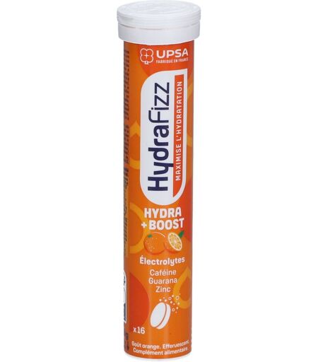 Complément alimentaire à utiliser dans le cadre d’une alimentation variée, équilibrée et d’un mode de vie sain.Maximisez votre hydratation avec HydraFizz BOOST !Une association unique :Des électrolytesQui maximisent votre hydratation en améliorant l’absorption de l’eau.Avec de la caféine,du guarana,des vitamines C et B3,du magnésium et du zinc :Pour booster votre énergie, réduire votre fatigue, améliorer votre vigilance et protéger vos cellules contre le stress oxydatif.IngrédientsSucres (saccharose, sirop de glucose déshydraté), Acidifiants : acide citrique, acide malique, Correcteurs d’acidité : carbonate de sodium, citrate de sodium, Sel, chlorure de potassium, carbonate de magnésium, Arôme naturel, Extraits de plantes : Guarana, Thé vert, Vitamines : Vitamine C, Vitamine B3 (niacine), Minéraux : Zinc, Magnésium, Caféine, édulcorant : glycosides de stéviol, Colorants : caroténoïdesValeurs nutritionnellesÉlémentPar portion (2 comprimés)% VNR*Énergie53 kJ / 13 kcal-Matières grasses0 g0%Glucides3,0 g-— dont sucres2,5 g-Fibres alimentaires0 g-Protéines0 g0%Sel0,59 g10%Vitamine C80 mg100%Vitamine B316 mg100%Zinc10 mg100%Magnésium375 mg100%Caféine75 mg-Conseils d'utilisationÀ déguster à tout moment de la journée.Poids net70,6 gAdresse du FabricantUPSA SAS 3 rue Joseph Monier 92500 Rueil-Malmaison ...