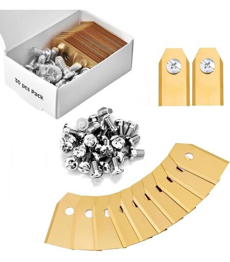 Compatible avec les plus grandes marquesnos lames de tondeuse à gazon conviennent aux produits, Gardena et Yardforce. Remplacez vos anciennes lames de robot tondeuse d'origine par notre produit compatible.Coupe de pelouse parfaiteobtenez une coupe de pelouse parfaite avec nos lames de tondeuse à gazon. Adieu les touffes d¿herbe indésirables qui gâchent l¿image de votre jardin.Ordre et commoditéEnsemble de 30 lames de tondeuse à gazon, nos lames de robot sont livrées dans une petite boîte pour un rangement et une commodité faciles. Avec les lames de tondeuse à gazon, gardez votre jardin toujours en parfait état.Résistance garantie la qualité est notre priorité, c'est pourquoi nous fabriquons nos produits avec soin et avec les meilleurs matériaux. Nos lames de tondeuse à gazon sont en titane avec des vis galvanisées, pour garantir une résistance maximale.Satisfaction garantie Votre satisfaction est notre priorité ! Achetez nos lames de tondeuse à gazon sans soucis, si vous n'êtes pas satisfait nous vous rembourserons votre prix d'achat.propose des produits 100% de qualité..La livraison depuis la France est prévue dans 5 jours ouvrés, n'hésitez pas à passer votre commande ...
