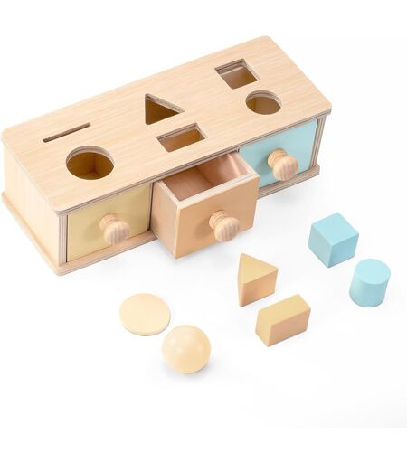 Jouet de Tri Boîte de permanence avec 3 tirages et 6 blocs géométriques en bois. Il y a 6 trous de formes différentes sur la boîte, les enfants doivent mettre les blocs de bois dans les trous correspondants, et ces formes peuvent être trouvées en ouvrant les tiroirs.Jouer Tout en Apprenant le jouet de tri peut aider les tout-petits à développer la coordination ?il-main, la motricité fine, la reconnaissance des formes et des couleurs, la concentration, la pensée logique, la patience, l'imagination, la créativité et la résolution de problèmes.Matériau Sûr et Durable le jouet Montessori est fabriqué en bois de haute qualité, sûr et robuste, pas facile à casser, la surface et les bords sont lisses sans bavures, et ne blesseront pas les petites mains du tout-petit, assurant la sécurité des enfants qui jouent.Jeu Créatif Montessori les cubes de tri de formes en bois sont de couleurs vives, très faciles à attirer l'attention des enfants, les formes géométriques et les tiroirs sont juste de la bonne taille, faciles à saisir, parfaits pour les petites mains des enfants.Cadeau Idéal le jouet trieur de formes est un excellent cadeau pour les tout-petits, les garçons et les filles âgés de 2 à 5 ans pour un anniversaire, Noël, le Nouvel An, Pâques, la fête des enfants, Halloween, Thanksgiving, les vacances et autres anniversaires ou événements spéciaux.Attention Contient un jouet. La surveillance d'un adulte est recommandéeAttention Ne convient pas aux enfants de moins de 10 mois.Attention Ne convient pas aux enfants de moins de 3 ans. À util r sous la surveillance d'un adulte ...
