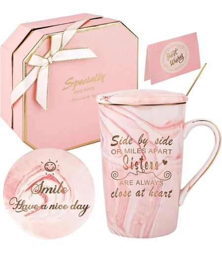 CADEAUX IDÉAUX POUR LES S?URS Cette tasse à café cadeau pour s?ur présente un magnifique design en marbre rose et un mes sincère qui se lit ""Side by Side or Miles Apart Sisters are Always Close at Heart"" (côte à côte ou à des kilomètres de distance, les s?urs sont toujours proches au c?ur). C'est la façon parfaite d'exprimer votre amour et votre appréciation pour votre s?ur. EMBALLAGE CADEAU CHALEUREUX Que vous célébriez l'anniversaire d'une s?ur ou que vous souhaitiez simplement lui témoigner votre reconnaissance, cet ensemble de tasses à café constitue un cadeau idéal pour votre s?ur. L'emballage cadeau inclus ajoute MATÉRIAU DE HAUTE QUALITÉ Notre tasse s?ur est faite de céramique durable de haute qualité, le motif est clair, sans plomb et lavable au lave-vaisselle, La capacité de 14 oz/420ml est parfaite pour profiter d'une tasse de café ou de thé le matin ou tout au long de la journée. UTILISATION POLYVALENTE Ce mug peut être utilisé non seulement pour le café ou le thé, mais aussi pour le chocolat chaud, la soupe ou toute autre boisson que vous désirez. Il est parfait pour une utilisation à la maison, au bureau ou en déplacement. PARFAIT POUR L'AMITIÉ Ce set de tasses à café n'est pas seulement destiné aux s?urs, il est également idéal pour les amies qui sont comme des s?urs. Le mes sur la tasse est un grand rappel du lien partagé entre les amis proches, ce qui en fait un cadeau réfléchi pour toute oc n. ...