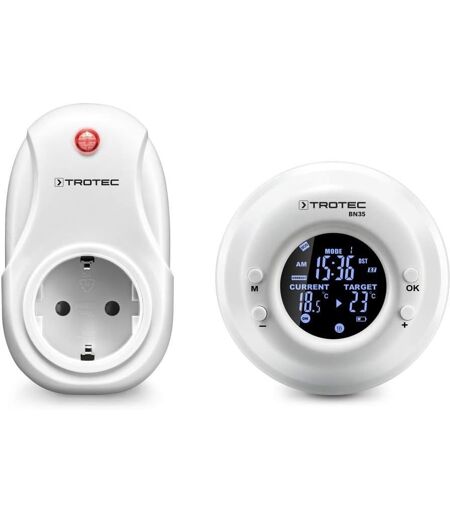 Branchez Thermostat BN 35 Contrôlez l'allumage et l'extinction à partir d'un ou de plusieurs appareils. La portée sans fil (sans obstacles) est d'environ 20 mètres. Un seul thermostat sans fil (émetteur) permet de commander simultanément jusqu'à 100 pr s radio (récepteur). Grâce à la fonction de minuterie, vous pouvez également assurer une température agréable avant d'entrer dans une pièce - idéal pour la salle de bains. Le thermostat sans fil permet de régler la température ambiante souhaitée dans une plage de 0 °C à 70 °C en 1 °C fin (ou Fahrenheit). Pour que la température ambiante souhaitée soit effectivement atteinte, l'appareil de chauffage ou de refroidissement connecté doit bien sûr avoir les performances appropriées. Il est également possible de programmer la m en marche et l'arrêt des appareils connectés. Le thermostat sans fil est votre télécommande. Vous pouvez également contrôler des pr s radio distantes facilement depuis votre domicile. La portée est de 20 mètres, mais il ne doit pas y avoir d'obstacles sur le chemin, afin que le rayonnement radio ne soit pas affaibli ou interrompu. Le kit BN35 se compose d'une pr radio et d'un thermostat radio. Il suffit de brancher la pr radio sur une pr murale et de connecter votre appareil électrique à la pr de la pr radio. Grâce au thermostat radio, vous pouvez désormais régler la température souhaitée à distance. Le thermostat radio mesure la température ambiante à l'endroit où vous vous trouvez et active ou désactive le chauffage ou le climat ur en conséquence. ...