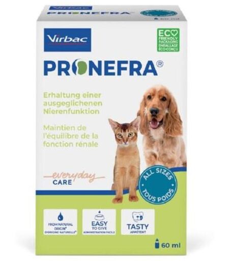 Caractéristiques du Virbac Pronefra Virbac Pronefra est un aliment complémentaire qui soutien la fonction rénale en cas d'insuffisance chronique.PRONEFRA est indiqué chez le chat et le chien pour soutenir la fonction rénale en cas d'insuffisance rénale chronique. C'est un produit fortement appétent associant 5 ingrédients :- le carbonate de calcium et le carbonate magnésium diminuent la disponibilité du phosphore alimentaire par chélation dans l'intestin- le chitosan est connu comme chélateur des toxines urémiques dans les intestins- les polysaccharides de l'astragale sont connus pour contribuer au maintien de la structure normale du rein en limitant la progression de la fibrose- les oligopeptides d'origine marine contribuent au maintien d'une pression artérielle équilibrée.Indicationpour les chats et les chiens atteints d'insuffisance rénale chroniqueRecommandations nutritionnellesBien remuer avant utilisation. Une légère sédimentation est normale. Administrer de préférence au moment des repas, à l'aide de la seringue doseuse (1 ml / 4 kg deux fois par jour). Cette utilisation initiale peut durer jusqu'à 6 mois. En raison de son appétence, PRONEFRA® est facile à administrer. Il peut être mélangé à l'aliment ou donné directement dans la bouche de l'animal à l'aide de la seringue fournie. Ne pas dépasser la dose recommandée. De l'eau doit être à disposition en permanence. Avant utilisation ou avant prolongation de la durée d'utilisation, il est recommandé de demander l'avis d'un vétérinaire. Conserver à l'abri de l'humidité et de la chaleur. Durée de conservation : 24 mois.PRONEFRA® étant un aliment complémentaire destiné à maintenir l'équilibre de la fonction rénale chez le chat et le chien, ce produit peut ne pas convenir à certains animaux âgés ou sous traitement médical ayant une sensibilité digestive particulière liée à leur état de santé. En cas de régurgitations, il est conseillé par précaution de diminuer provisoirement la quantité recommandée de produit pendant quelques jours, et de consulter son vétérinaire si cette régurgitation persiste.Bien remuer le flacon avant utilisationDévisser le bouchon blanc pour ouvrir le flaconVissez l'ADAPTACAP sur le flacon Maintenir le flacon en position verticale et ouvrir l'ADAPTACAP. Insérer fermement la seringue doseuse Renverser le flacon et tirer lentement sur le piston de façon à remplir la seringue doseuse. Prélever la quantité recommandée en fonction du poids de l'animal.Replacer le flacon en position verticale et retirer la seringue doseuse de l'ADAPTACAP® en la tournant doucement. Fermer l'ADAPTACAP. Vider la seringue avec précaution et mélanger le produit avec la nourriture. Autre possibilité : Placer et vider doucement la seringue dans la bouche de l'animal. Assurez vous que l'animal avale bien le produit.Garder toujours le flacon bien fermé avec l'ADAPTACAP. Rincer soigneusement la seringue à l'eau claire après chaque utilisation.CompositionAcides gras estérifiés au glycérol, astragale... ...