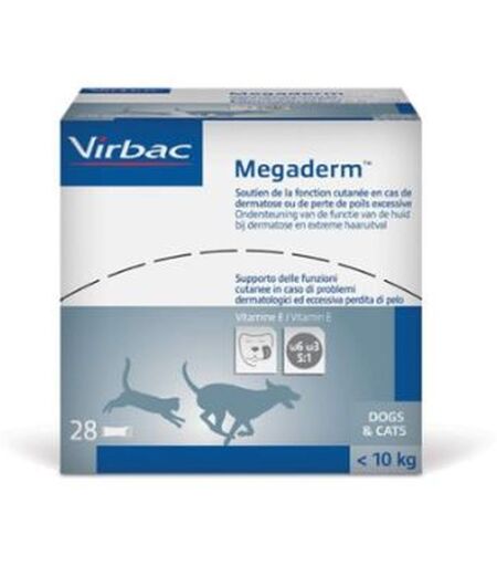 MEGADERM est à utiliser en soutien de la fonction dermique en cas de dermatose et de dépilation. L'aliment complémentaire diététique peut aussi vous aider à prendre soin de la peau et du pelage de votre animal. En cas de dermatose ou de dépilation Pour chat ou petit chien de moins de 10 kg Pour ouvrir le sachet, déchirer ou découper le long des pointillés. Déverser le contenu du sachet sur la nourriture habituelle de votre animal puis mélanger. 1 sachet par jour jusqu’à deux mois. Il est recommandé de demander conseil à un vétérinaire avant l’administration ou la prolongation de la durée d’administration. Huile de tournesol, huile de poisson, huile d’onagre. ...