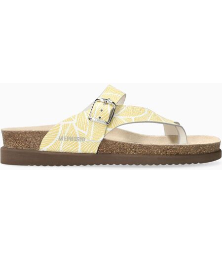 Modèle HELEN de la marque MEPHISTO : Cet entre-doigt iconique au look décontracté, offre une parfaite sensation de bien-être. L'ajustement au pied est assuré par la fermeture à boucle. Cette sandale jaune pour femme est composée de cuir impression florale. ...