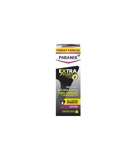 Description du produit Paranix Extra Fort 5 minutes Lotion Anti-Poux et Lentes ? Lotion 100% efficace* et protège 72h contre les réinfestations ? Format Familial 200 ml ? Peigne fin en métal inclus La Lotion Paranix Extra Fort est 100 % radicale ...