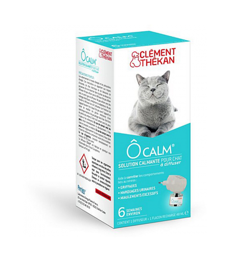 Clément Thékan ÔCalm, une solution apaisante pour les chats stressés, offre un soulagement sans effet sédatif. Ce produit contribue au bien-être de votre compagnon en créant un environnement propice. La solution calmante aide à contrôler les comportements liés au stress tels que les griffades, les marquages urinaires ou les miaulements excessifs. Ôcalm peut être utilisé lors de déplacement ou dans des situations de stress temporaires. Il referme un analogue de phéromones du chat et un extrait de Nepeta cataria (herbe à chat). Le spray transmet ainsi à votre chat un sentiment de bien-être, l'aidant à maîtriser les comportements liés au stress. Kit contenant le diffuseur et un flacon recharge. Conserver le flacon recharge bien fermé lorsqu'il n'est pas utilisé. À conserver à température ambiante (<25°C) dans l’emballage d’origine, dans un endroit sec, inaccessible aux enfants et aux animaux de compagnie. Garder sous clef. Le flacon doit rester en position verticale pour éviter tout risque d'incendie ou de choc en raison d’une fuite potentielle du liquide. Utiliser uniquement des recharges Ôcalm® avec le diffuseur Ôcalm® et inversement. Les propriétés et la sécurité du produit ne peuvent être garanties si un autre appareil est utilisé. L'utilisation d'autres substances peut augmenter la toxicité ou l'inflammabilité du produit. Ne couvrez pas le diffuseur. Ne placez pas le diffuseur derrière ou sous les meubles. Lors de l'utilisation de produits électriques, les précautions d’emploi doivent toujours être suivies, y compris les suivantes :Lisez toutes les instructions avant utilisation. Pour réduire le risque de blessures, une surveillance étroite est nécessaire lorsqu'un produit est utilisé près d'enfants. Ne pas placer les doigts ou les mains dans le diffuseur. L’assemblage par un adulte est requis. Les surfaces du diffuseur atteignent des températures élevées pour la diffusion. Ces surfaces ne doivent pas être touchées lorsqu'elles sont branchées. Pour éviter tout risque d’électrocution :Utiliser uniquement de manière appropriée sur une prise électrique 220-230 volts fonctionnant correctement. Aucun adaptateur ou câble électrique ne doit être utilisé avec ce produit. Vérifiez que la tension dans la maison est identique à celle indiquée sur le diffuseur. Ne pas plonger dans l'eau ou brancher dans des endroits humides. Lorsqu'il est branché, ne touchez pas le diffuseur avec des objets métalliques ou des mains humides. Éviter le contact avec la peau, les yeux ou les vêtements. Se laver soigneusement les mains avec du savon et eau après manipulation. Si des irritations persistent, consulter un médecin. DANGER : PEUT ÊTRE MORTEL EN CAS D’INGESTION ET DE PÉNÉTRATION DANS LES VOIES RESPIRATOIRES. TENIR HORS DE PORTÉE DES ENFANTS ET DES ANIMAUX DE COMPAGNIE. NE PAS INGÉRER. EN CAS D’INGESTION : APPELER IMMÉDIATEMENT UN CENTRE ANTI-POISON, UN MÉDECIN. NE PAS FAIRE VOMIR. CONSULTER LA NOTICE AVANT UTILISATION. ...