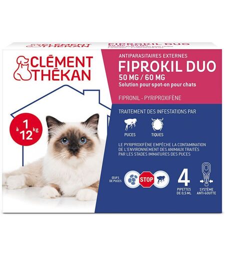 PIPETTE ANTI-PUCES ET ANTI-TIQUES : FIPROKIL DUO Chat protège votre chat contre les parasites les plus courants : puces (adultes et œufs) et tiques PROTECTION 2 EN 1 : Actif contre les œufs de puces, FIPROKIL DUO Chat empêche leur développement en puces adultes et protège votre chat et son environnement sur la durée : jusqu'à 12 semaines EFFICACITÉ PROUVÉE : FIPROKIL DUO Chat protège efficacement votre chat contre les puces jusqu'à 5 semaines et contre les tiques jusqu'à 1 semaines PROTÈGE CHATS ET CHATONS : FIPROKIL DUO Chat peut être utilisé chez les chats et les chatons à partir de l'âge de 10 semaines et lorsqu'ils pèsent au moins 1 kg APPLICATION FACILE : FIPROKIL DUO Chat possède un système anti-goutte qui permet la libération de la solution uniquement par pression sur la partie centrale de la pipette Conseils d'utilisation Voie d'administration : externe. La dose minimale recommandée est de 8,3 mg de fipronil et 10 mg de pyriproxyfène par kg de poids corporel soit : Chat de 1 kg à 6 kg : 1 pipette de 0,5 ml par animal. Chat de 6 kg à 12 kg : 2 pipettes de 0,5 ml par animal. A appliquer directement sur une zone que l'animal ne peut pas lécher. L'intervalle minimum entre 2 traitements doit être de 4 semaines. Composition fipronil 50 mg, pyriproxifène 60 mg. Excipients : butylhydroxyanisole (E 320) 0,10 mg, butylhydroxytoluène (E 321) 0,05 mg, diéthylène glycol monoéthyl éther Indications Prévention et traitement des infestations par les puces (Ctenocephalides felis.), tiques (ixodes ricinus et rhipicephalus turanicus) chez le chat entre 1 kg et 6 kg. Contre-Indications Chat de moins de 10 semaines, chat de moins de 1 kg. Ne pas utiliser chez les lapins. Ne pas utiliser chez l'animal malade ou convalescent sans avis du vétérinaire. Allergie à l'un des composants. Conditionnement 4 pipettes de 0,5 ml Il est indispensable de demander l’avis de votre vétérinaire ou de votre pharmacien. Si les symptômes persistent, consultez votre vétérinaire. ...