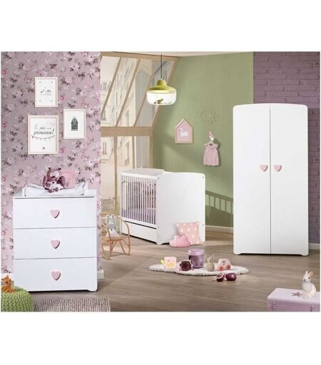 Une chambre complete pour bébé, composée d'un lit 120x60, d'une commode a langer et d'une armoire. Une collection essentielle pour l'arrivée de bébé, laquée blanc et agrémentée de boutons coeur rose tendre. ...