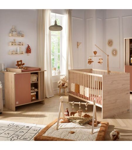 Préparez-lui une petite chambre élégante au design hyper actuel avec le lit de la collection Tokyo. La collection TOKYO est un vrai coup de c?ur : toutes les fonctionnalités de la chambre de bébé avec la touche déco en plus ! Elle intègre la grande tendance ameublement du moment, les claustras, pour créer des espaces à la fois séparés et aérés. Son décor bois très chaleureux et ses belles galeries de lit en hêtre naturel vont vous faire craquer pour cette collection qui s'accordera à toutes les ambiances. Dormez tranquille, cette chambre répond à toutes les normes de sécurité. Composée d'un lit bébé 70x140 cm et d'une commode à langer, cette chambre allie esthétique chaleureuse et praticité. Pratique, le lit bébé évolue en lit junior utilisable jusqu'à 7 ans ! ( kit de transformation non inclus) Caractéristiques : Chambre comprenant un lit bébé 140x70 cm et une commode à langer Commode avec détails claustras Matériaux robustes et respectueux de l'environnement Produits certifiés pour assurer la sécurité de bébé Spécifications : Lit bébé 140x70 évolutif : Sommier en hêtre réglable à 3 hauteurs Long pans de transformation pour le lit junior en option Dimensions : 144 x 87 x 76 cm Conforme à la norme : NF EN 716 1&2; + NF D 60-300-4 Fabriqué en France (hormis sommier et galeries ¿ fabrication Europe) Commode à langer : Commode 1 porte et 3 niches, dispositif à langer utilisable jusqu'à 15 kg Dimensions : 87 x 87 x 47 cm Surface à langer prévue pour un matelas de dimensions : 68 x 52 cm Conforme à la norme NF EN 12221 1&2; (version juillet 2008) + A1 (version 2013) Fabriqué en France Meubles livrés en kit, à monter soi-même Matelas de lit et matelas à langer non inclus. Tiroir de lit non inclus. Long pans de transformation du lit non inclus. Conseils d'entretien : Dépoussiérage chiffon sec : pas de solvant Tâches rebelles : éponge légèrement humide ...