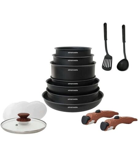 Arthur Martin - AM1502 Batterie de cuisine 15 pieces - poignee amovible effet bois - tous feux dont induction