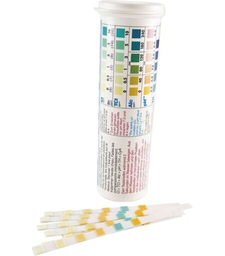 Description générale Cette boîte contient 50 bandelettes d'analyse MAREVA, idéales pour un contrôle complet de la qualité de l'eau de votre piscine. En quelques minutes, vous pouvez effectuer 6 tests essentiels : chlore disponible (brome), chlore total, alcalinité, pH, dureté totale et acide cyanurique. Assurez-vous ainsi de la propreté de l'eau et prenez les mesures nécessaires pour maintenir une baignade saine et agréable. Spécifications techniques Contenu : 50 bandelettes Tests disponibles : Chlore, Chlore total, Alcalinité, pH, Dureté totale, Acide cyanurique Compatibilité et accessoires Compatible avec toutes les piscines nécessitant un contrôle régulier de la qualité de l'eau. Aucun accessoire supplémentaire n'est requis. Installation Aucune installation nécessaire, les bandelettes sont prêtes à l'emploi. Utilisation Plongez la bandelette dans l'eau à analyser, en veillant à mouiller tous les réactifs. Laissez agir pendant une minute. Comparez les résultats avec l'échelle ...
