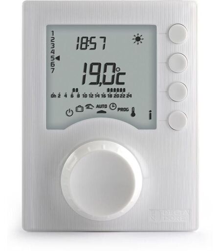 Description générale Le Thermostat Programmable Delta Dore Tybox 117+ est une solution idéale pour optimiser la gestion de vos systèmes de chauffage. Conçu pour contrôler chaudières, pompes à chaleur non réversibles et poêles à granulés, il allie confort et économies d'énergie. Spécifications techniques Poids : 190 grammes Dimensions : 104 mm de haut, 80 mm de large, 35 mm de profondeur Alimentation : 2 piles alcalines LR03 (incluses) Température de fonctionnement : -10 à 40 °C Écran : LCD rétroéclairé Régulation : PID et Tout ou Rien (ToN) Compatibilité et accessoires Compatible avec : Chaudières Pompes à chaleur non réversibles Poêles à granulés Installation Facile à installer grâce à son fonctionnement sur piles, sans câbles supplémentaires. La documentation peut être rapidement consultée via un code QR. Utilisation Le Tybox 117+ permet une programmation quotidienne ou hebdomadaire avec des réglages personnalisables. Il offre deux consignes de température : Confort et Économie , ...
