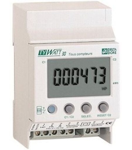 Description générale Le compteur TYWATT 30 de DELTA-DORE est un indicateur de consommation conçu pour mesurer le nombre de kilowattheures (kWh) consommés par une installation électrique. Il est idéal pour suivre la consommation durant une saison de chauffage, grâce à sa fonction de double compteur (un permanent et un initialisable). Compatible avec tous les types de compteurs monophasés, il permet une lecture claire des consommations au tableau électrique. Spécifications techniques Alimentation : 230V, +/-10%, 50 Hz Consommation : 0,5 VA Température de fonctionnement : 0 à +40°C Température de stockage : -10°C à +70°C Dimensions : 3 modules de 18 mm Intensité nominale de fonctionnement : 2 à 90A, Cos φ = de 0,8 à 1 1 entrée contact heures creuses, 230V 1 entrée bus télé-information pour compteur électronique monophasé 1 entrée pour transformateur d’intensité externe (diamètre intérieur : 10 mm maxi) Compatibilité et accessoires Compatible avec tout type de compteur monophasé ...