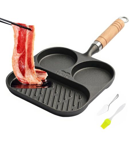 Letnerny-Poêle À Griller Antiadhésive, Poêle À ?ufs 3 En 1 En Fonte Divisée Avec Poignée En Bois, Poêle Polyvalente À 3 Sections Pour Petit-Déjeuner, ?ufs, Bacon, Steak, Hamburgers (Noir)