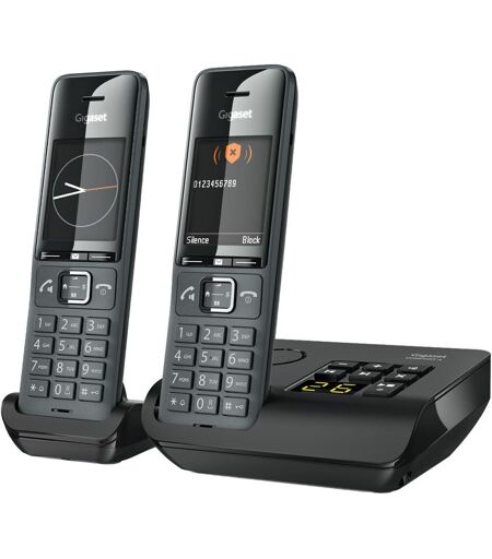 LA TECHNOLOGIE RENCONTRE LE DESIGN - Le Gigaset COMFORT 520A Duo se distingue par son design élégant et intemporel et par son grand écran couleur de 2,2"" - Le partenaire idéal pour votre domicile ou votre bureau. Compatible uniquement en France. Plus d'infos sur la page d'accueil de Gigaset.FONCTIONNALITÉS EXCEPTIONNELLES - Appels téléphoniques et mains libres en qualité HD - Connexion casque (pr jack 3,5 mm) - Blocage d'appel pour 150 numéros - Répertoire jusquà 200 contactsINSTALLATION FACILE - Connexion de la base à la pr téléphonique murale - Profitez d'une installation rapide et facile de votre nouveau téléphoneQUALITÉ MADE IN GERMANY - Design et fabrication en Allemagne - la technologie ECO DECT respectueuse de l'environnement permet de réduire la consommation d'énergieLIVRAISON - 1x Gigaset COMFORT 520A base, 2x Gigaset COMFORT 520A combiné, 2x adaptateur secteur, 1x câble de connexion téléphonique, 4x batteries rechargeable AAA (NiMH), 2x couvercle de batterie, 2x clip ceinture, 1x mode d'emploi ...