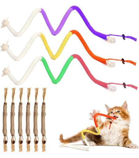 Jouets à mâcher pour chats Vous recevrez 3 jouets à mâcher pour chats et 6 bâtonnets à la menthe pour chats. Les bâtonnets colorés à la menthe attirent les chats et les aident à trouver rapidement les jouets. C'est la combinaison idéale pour divertir votre chat et stimuler ses instincts naturels. Sécurité et santé Ce jouet à mâcher pour chat est fabriqué à partir de cordes en coton enroulées à la main. Les 6 bâtonnets à mâcher pour chat sont enduits d'ingrédients à base de menthe à chat, fabriqués à partir de plantes naturelles et de matières premières naturelles de haute qualité. Hygiène buccale Les jouets à la menthe pour chats favor nt une mastication saine, aident les chats à développer leurs dents définitives et éliminent la plaque dentaire et le tartre pendant la mastication, rafraîchissent l'haleine, protègent la santé bucco-dentaire et renforcent le lien entre vous et votre animal. Jouet interactif pour chat Les jouets à mâcher à base d'herbe à chat sont spécialement conçus pour les chats domestiques et favor nt leur instinct naturel de jeu. Ils sont parfaits pour jouer et interagir avec votre chat, et constituent un excellent jouet pour l'entraîner et le rendre plus agile. Le cadeau idéal pour les chats Les jouets à mâcher en corde sont le cadeau idéal pour les chats, car ils aident à soulager leur ennui, à réduire leur anxiété de séparation et leur ennui, et à les maintenir en bonne santé et actifs. Offrez à votre chat le meilleur jouet à mâcher pour lui apporter plus de joie et de santé ! ...