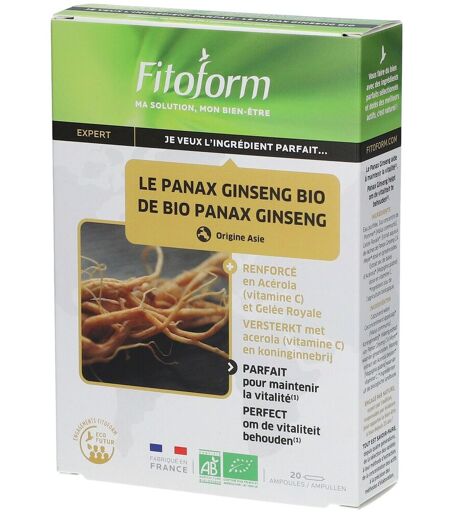 Complément alimentaire à utiliser dans le cadre d’une alimentation variée, équilibrée et d’un mode de vie sain.Le Panax Ginseng C.A Meyer d’Asie est une variété qui contient les phyto-nutriments testés par les études scientifiques, les ginsénosides. Il est récolté à partir de 6 ans d’âge pour que la concentration en ginsénosides soit optimale. Ce complément alimentaire est dosé à 20 mg de ginsénosides, la dose quotidienne reconnue pour ses effets bénéfiques, combiné à la vitamine C de l'Acérola et aux phyto-nutriments de la Gelée Royale. Bénéfices Nature respectée Fabrication française Sans conservateur Sans colorant Composition:Eau purifiée. Jus concentré de Pomme* (Malus communis). Gelée Royale*. Extrait aqueux de racines de Panax Ginseng* CA Meyer dosé en ginsénosides. Extrait sec de baies d’Acérola* (Malpighia glabra) (support maltodextrine*) dosé en vitamine C.* Ingrédients issus de l'agriculture biologique.Données nutritionnelles Pour 1 ampouleJus de Pomme : 1810 mgGelée royale : 500 mgExtrait de Ginseng : 266 mg … soit 665 mg équivalent plante sèche … Dont 20 mg de ginsénosidesExtrait d’Acérola : 258 mg… Dont vitamice C : 40 mg soit 50% des VNR**Valeurs nutritionnelles de référence Conseil d'utilisation:1 ampoule par jour (de préférence le matin) à diluer dans un verre d’eau au cours du repas, pendant 20 jours. Renouvelable suivant les besoins.Précautions d'emploi:À conserver au frais, au sec et à l’abri de la lumière.Tenir hors de portée des jeunes enfants.Ne pas dépasser la dose journalière recommandée.Les compléments alimentaires doivent être utilisés dans le cadre d’un mode de vie sain et ne pas être utilisés comme substituts d’un régime alimentaire varié et équilibré.Déconseillé aux personnes sous traitement antidiabétique.Déconseillé aux personnes allergiques aux produits de la ruche.Poids net: 20 ampoulesFabricant: Fitoform ZAC de la Prato 84210 Pernes les fontaines France ...