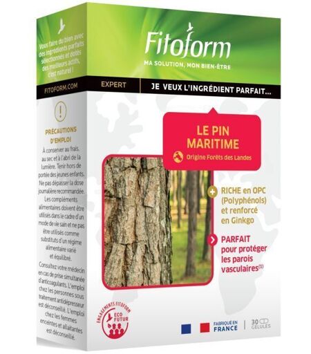 Complément alimentaire à utiliser dans le cadre d’une alimentation variée, équilibrée et d’un mode de vie sain.Fitoform Le Pin Martitime est un complément alimentaire formulé à partir d'extrait d'écorces de Pin maritime et de feuilles de Ginkgo biloba. Ce complément est dosé à 50 mg d'OPC (proanthocyanidines) provenant de Pin maritime, connu pour ses effets bénéfiques sur la circulation sanguine. Ce produit peut contribuer à maintenir la santé vasculaire grâce à ses polyphénols, souvent absents de l’alimentation courante.IngrédientsGélule végétale (hypromellose), Extrait d'écorces de Pin maritime des Landes françaises (Pinus pinaster), Extrait de feuilles de Ginkgo biloba, Fibre de gomme d'acacia, Maltodextrine, Calcium citrate, Sirop de riz déshydraté, Talc.Valeurs nutritionnelles Composant Quantité par 1 gélule Extrait d'écorces de Pin maritime 55 mg …dont OPC 50 mg Extrait de feuilles de Ginkgo biloba 15 mg / 750 mg* Conseils d'utilisationPrendre 1 gélule par jour, de préférence le matin, avec un verre d'eau pendant le repas, pendant 1 mois.Précautions d'emploiNe pas dépasser la dose journalière recommandée. Conserver dans un endroit frais et sec. Tenir hors de portée des enfants. Déconseillé aux femmes enceintes, aux femmes allaitantes, et aux personnes sous antidépresseurs. Consulter un médecin avant usage si vous prenez des anticoagulants.Poids net20 capsulesAdresse du FabricantFitoform Compagnie18 allée du prato, ZAC Prato 184210 Pernes-les-fontainesFrance ...