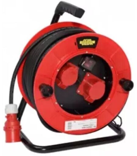 Enrouleur éléctrique CEBA 400 V triphasé avec son châssis en tube de Ø 22 mm peint en noir. Caractéristiques : Marque : CEBA Alimentation : 380 V / 415 V Câbles : 25 mètres 5G2,5 - 32A / 415 V Indice de protection : IP44 2 socles P17 à clapet Bobine 330 mm en matière isolante démontable Prise P17 - 200 Hz Puissance maxi. disponible en câble : 6080 W câble déroulé Puissance maxi. disponible en câble : 2800 W câble enroulé ...