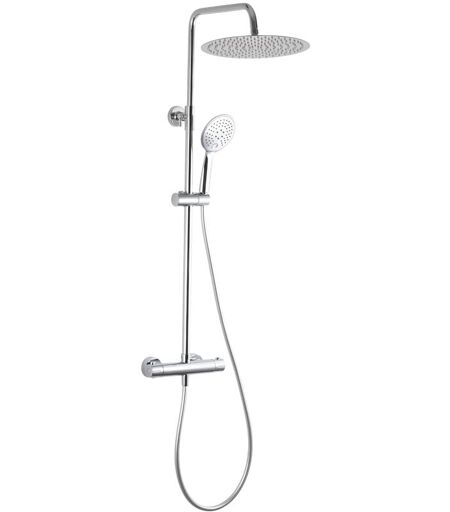 DESCRIPTION GÉNÉRALE Mitigeur avec cartouche thermostatique pour un confort d'utilisation, inverseur intégré côté débit et bouton de sécurité anti-brûlure à 38°C. Entraînement réglable de 150 mm, adaptable aux canalisations existantes. Comprend deux rosaces chromées et des filtres anti-retour. SPÉCIFICATIONS TECHNIQUES Douche de tête : matière INOX, extra plate, diamètre 300 mm, orientable, picots anti-calcaire Douchette à main : matière ABS, finition chromée, 3 jets, diamètre 125 mm, sélection du jet en un clic, picots anti-calcaire Flexible : matière PVC lisse, longueur 1.50 m, structure renforcée anti-torsion, écrous tournants Colonne : matière inox, couleur chromée, diamètre 19/22 mm, barre réglable en hauteur, fixation murale ajustable Hauteur min : 770 mm, hauteur max : 1170 mm, profondeur : 345 mm Garantie : robinet 5 ans, pièces d'usure 1 an INSTALLATION Livré avec une notice de montage, joints, raccords excentrés, rosaces et visserie inclus. AUTRES INFORMATIONS Laiton utilisé ...
