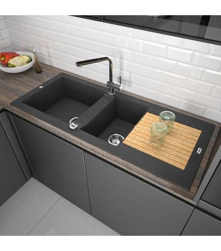 Description générale Évier à encastrer ÉOLE à 2 bacs, fabriqué en France à partir de Carealith®, un matériau minéral composite léger et résistant. Il est fourni avec une planche en bambou amovible, servant à la fois d'égouttoir et de planche à découper. Cet évier allie esthétique et fonctionnalité, avec une surface lisse et soyeuse au toucher, facile à entretenir. Spécifications techniques Dimensions de la cuve 1 : 41.4 x 40.4 cm Dimensions de la cuve 2 : 24.9 x 40.4 cm Épaisseur du plan de travail : 28 à 38 mm Matériau : Carealith®, composé à 85% de minéraux (quartz, granit) Garantie : 7 ans Compatibilité et accessoires Livré avec notice de pose Système de vidage automatique Accessoires inclus : bonde, panier, siphon, système d'actionnement de fermeture/ouverture automatique Installation Facile à installer, cet évier est conçu pour s'encastrer dans un meuble de 80 cm. La notice de pose fournie guide l'utilisateur étape par étape pour une installation réussie. Utilisation Résistant à ...