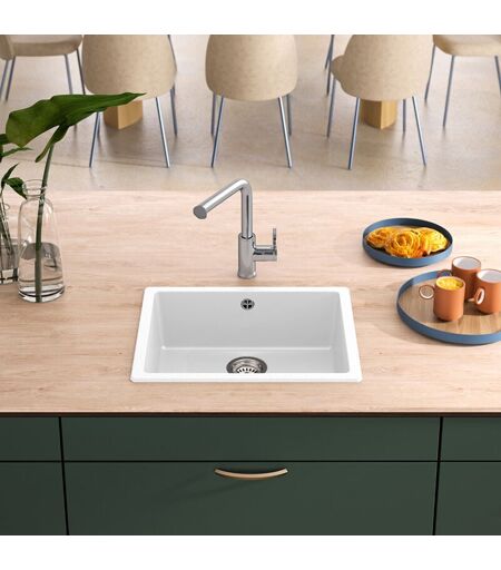 Évier sous et sur plan MODULA 1 bac Évier Modula 1 bac - 56x46x19 cm S'encastre dans un meuble de 60 cm - Livré non percé Livré avec notice de pose, système de vidage manuel et accessoires (bonde, panier, siphon). Fixations vendues séparément. Fabriqué en France et garanti 7 ans, l'emballage de transport est sécurisé et soigné. Découvrez notre évier de cuisine en Carealith®, un matériau minéral composite léger et résistant offrant de nombreux avantages : Composé à 85% de minéraux (quartz, granit, etc.) et un liant inerte qui rend la surface robuste et les couleurs profondes. Hygiénique : une surface régulière et homogène qui ne retient ni l'eau ni la saleté, garantissant très peu de développement bactérien. Conforme au contact alimentaire. Résistant à la chaleur jusqu'à 300°C et au froid jusqu'à -40°C. Solidité face aux chocs et aux rayures, facile à entretenir et insensible aux produits d'entretien. Pigmenté dans la masse de 5mm d'épaisseur pour conserver l'aspect d'origine dans le ...