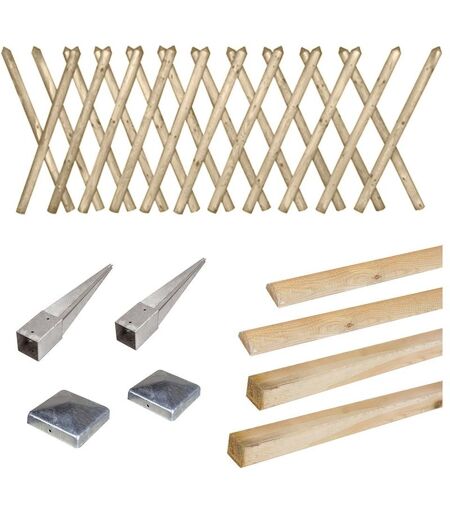 Description générale Le kit clôture Prunus 80 à enfoncer est idéal pour délimiter votre espace extérieur tout en apportant une touche esthétique. Ce kit complet comprend tous les éléments nécessaires à l'installation d'une barrière robuste et durable. Spécifications techniques Barrière Prunus : Pin Sylvestre traité, dimensions 80 cm de hauteur x 250 cm de longueur, demi-rondins de 55 mm cloués. Poteaux : En pin sylvestre traité autoclave classe III, dimensions 120 cm de longueur x 7 cm de largeur x 7 cm de hauteur. Supports de poteau à enfoncer : Acier galvanisé, dimensions 7 cm x 7 cm, hauteur totale 75 cm (hauteur d'enfoncement 60 cm, hauteur de support du poteau 15 cm). Dessus de poteau : Acier galvanisé, dimensions 7,4 cm x 7,4 cm x 3 cm, forme pyramidale. Traverses de clôture : Pin traité autoclave, dimensions 7 cm x 250 cm. Équerres en L : Pattes de fixation en acier zingué avec vis incluses. Compatibilité et accessoires Compatible avec des poteaux de 7 cm x 7 cm. Accessoires : ...
