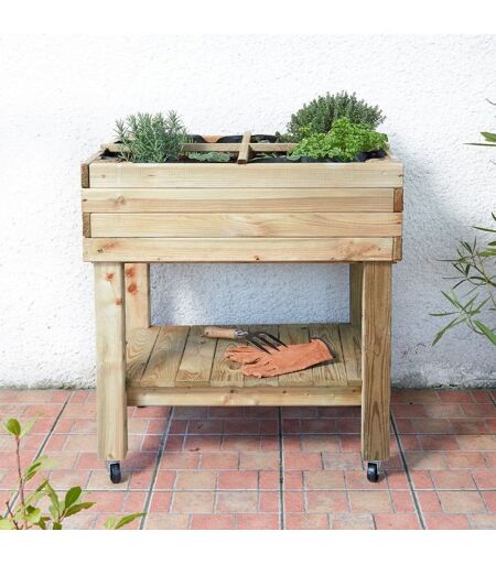 Carré potager sur pied en bois Idéal pour entretenir facilement son potager, sans avoir à se baisser! En pin sylvestre issu de forêts gérées durablement et traité autoclave classe III, pour résister aux intempéries et aux UV. Le potager est muni d'un feutre géotextile noire, qui permet de retenir la terre à l'intérieur de la structure, tout en maintenant la terre humide. Dimensions : 60 x 80 x ht 80. Hauteur/profondeur : 26 cm. Capacité : 124 L. Poteaux : 7x7 cm. Attention : les roulettes ne sont pas fournies. Conseils d'entretien : Le bois est une matière vivante dont l'aspect évolue avec le temps. Afin de garantir la longévité et la résistance aux intempéries de nos produits, ceux-ci sont traités selon le procédé >. Ce procédé peut entrainer l'apparition temporaire de tâches vertes sur le bois. Celles-ci sont normales et ne constituent en aucun cas un défaut. Elles disparaîtront naturellement avec le temps tandis que le produit conservera durablement tous les avantages ...