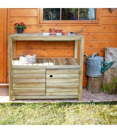 Table de rempotage Œillet en bois avec bac La table de culture est idéale pour jardiner agréablement : faire vos semis, rempoter ou transplanter sans vous baisser. Grâce à son étagère et son rangement intégré, vous n'aurez plus d'outils qui traînent partout dans le jardin. Son bac en acier galvanisé est idéal pour rempoter vos plantes et pour garder un plan de travail propre. Très pratique, cette table de préparation peut même servir de table haute ou de bar l'été ! Informations complémentaires : En pin sylvestre issu de forêts gérées durablement et traité classe III. Bac en acier galvanisé. Trou dans la porte pour facilité l'ouverture et la fermeture. Dimensions hors tout : L 100 x lg 44 x ht 95 cm. Dimensions du bac : L 30 x lg 40 x ht 8 cm. Hauteur entre plan de travail et étagère : 37 cm. Dimensions de la partie basse avec portes : L 41 x lg 96 x ht 42 cm. Épaisseur des pieds et des renforts : 4,3 cm. Livré en kit, à monter soi-même. Information importante : Le bois est une ...