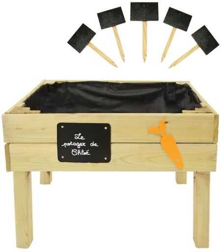 Description générale Le petit potager enfant en bois est un outil ludique et pédagogique parfait pour initier vos enfants au jardinage tout en s'amusant. Ce potager doit être utilisé sous la surveillance d'un adulte et peut être personnalisé par une peinture ou laissé en bois brut. Il est équipé d'une petite ardoise (15 x 12 cm) et d'une carotte à fixer à l'endroit de votre choix. Spécifications techniques Dimensions hors tout : L 60 x lg 40 x H 45 cm Dimensions intérieures du bac : L 56,5 x lg 37 x H 16 cm Capacité : 26 L Épaisseur : 14 mm Section des pieds : 43 x 43 mm Matériau : Pin sylvestre certifié FSC traité autoclave classe III Feutre géotextile inclus pour limiter les mauvaises herbes Lot de 5 étiquettes en ardoise à piquer inclus Compatibilité et accessoires Idéal pour les petits jardins, balcons ou terrasses. S'associe parfaitement avec des accessoires de jardinage adaptés aux enfants. Installation Facile à assembler, suivez les instructions fournies pour un montage rapide ...