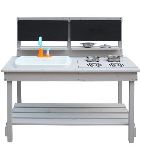 Cuisine d'extérieur pour enfant en bois peint Cette cuisine en bois unique et polyvalente est pleine d'activités ludiques pour les enfants âgés de 3 à 7 ans. Ils se sentiront dans une vrai cuisine. Avec son robinet fonctionnel, les jeunes cuisiniers pourront se laver les mains, remplir des verres et faire la vaisselle ! La cuisine possède tout le confort standard : - Une cuisinière : 4 plaques de cuisson - Un évier en plastique avec mitigeur et circuit d'eau fermé - Deux tableaux en ardoise pour noter les menus, les recettes... - Un espace de rangement sous les plaques de cuisson - Une étagère de rangement spacieuse - Des ustensiles de cuisine en acier : 1 poêle, 2 marmites, 1 spatule, 1 louche Caractéristiques techniques : Matière : en pin issu de forêts gérées durablement Traitement thermique : le bois est résistant aux influences climatiques telles que la pluie, et résiste donc à la pourriture. Couleur : gris clair et noir Dimensions hors tout : L 90 x lg 43 x H 90 cm Hauteur du ...
