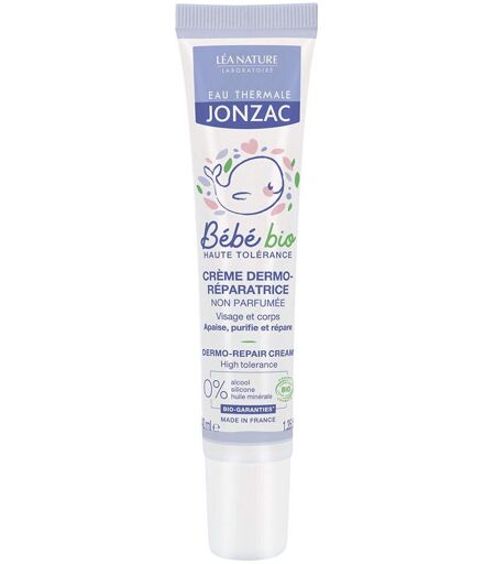 Crème dermo-réparatrice bio sans parfum pour nourrissons, à base d’eau thermale de Jonzac, cuivre et zinc, pour apaiser, réparer et protéger la peau fragile.IndicationIrritations cutanées, rougeurs passagères, peau fragile du bébé.ApplicationAppliquer 2 à 3 fois par jour sur une peau propre et sèche. Utiliser le gel lavant dermo-nettoyant au préalable. Ne pas appliquer sur des lésions suintantes.IngrédientsAqua (Water), Anthemis Nobilis Flower Water, Malva Sylvestris (Mallow) Extract, Caprylic/Capric Triglyceride, Glycerin, Octyldodecanol, Coco-Caprylate/Caprate, Sorbitan Olivate, Cetearyl Olivate, Cetearyl Alcohol, Bentonite, Glyceryl Stearate Citrate, Sodium Levulinate, Xanthan Gum, Sodium Stearoyl Glutamate, Sodium Benzoate, Glyceryl Caprylate, Glyceryl Undecylenate, Copper PCA, Hydrolyzed Hyaluronic Acid, Phytic Acid, Sodium PCA, Zinc PCA, Sodium Hydroxide, Lactic Acid, Helianthus Annuus (Sunflower) Seed Oil, Tocopherol, Cetyl Alcohol, Hydrogenated Lecithin, Palmitic Acid. ...