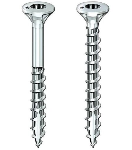 Acier zingué blanc sans chrome 6. 4 cavités sous tête : fraisage du bois et meilleur contact avec le métal. Triple cône : meilleure pénétration, haute résistance à la rupture. 6 stries en fond de filet : meilleur couple de vissage. Pas élargi : vissage plus rapide. Stries et diamètre des filets variables : moins de frottement, batterie économisée. Entaille coupante : suppression du fendage du bois. ...