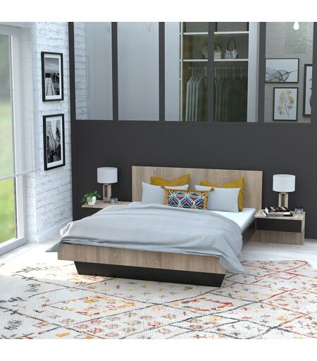 Le Quai Des Affaires - Lit cool 140x190 cm + 2 chevets + sommier / Décor Chêne blanchi & noir/ 192x234x75 cm