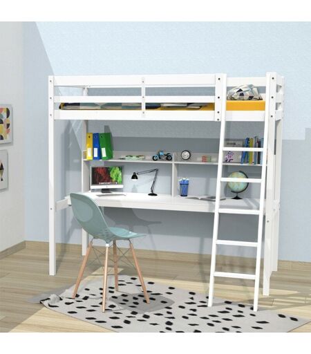 LE QUAI DES AFFAIRES Lit mezzanine STUDIO 90x190 + 1 sommier + bureau + étagère / Blanc/ 191 x 200.5 x 147