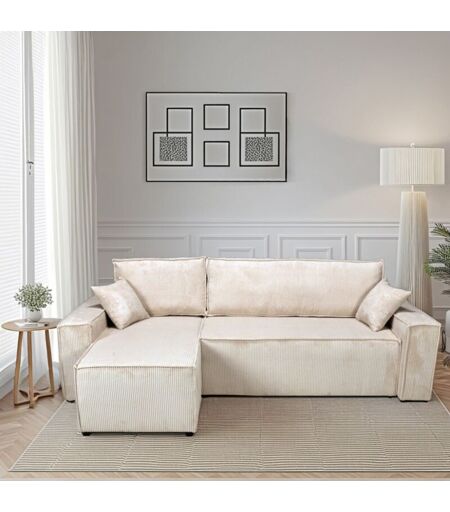 Canapé d'angle convertible et réversible ELISE en velours côtelé beige Partagez des moments conviviaux en famille ou entre amis avec le canapé ELISE. Son tissu en velours côtelé ultra tendance vous garantit un accueil doux et très confortable. En un rien de temps, il se transforme en lit pour transformer son salon en chambre d'amis! Un coffre sous l'assise permet de ranger vos affaires en toute discrétion.Les Plus produit :- Fonction convertible = se transforme en couchage d'une dimension de 140x204 cm. - Coffre de rangement sous l'assise de 142 Litres- Canapé réversible avec Méridienne à droite ou à gaucheCaractéristiques :- Canapé convertible et réversible- Structure en pin, panneaux d'aggloméré, contreplaqué et panneaux de particules.- Revêtement : tissu 90% polyester, 10% nylon, résistance à l'abrasion 35 000 cycles- Assise : Ressorts bonnel + feutre, cadre en eucalyptus, mouse densité 50kg/m3, panneau de particules.- Pieds plastiques- Produit utilisable pour un couchage ...