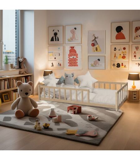DESCRIPTION GÉNÉRALE Le lit NINO 90 x 190 cm avec barrière de lit est conçu dans un style minimaliste et scandinave, apportant une touche décorative à la chambre des enfants. Sa barrière limite les risques de chutes, garantissant des nuits en toute sécurité. SPÉCIFICATIONS TECHNIQUES Dimensions : 197 x 97 x 36 cm Âge adapté : de 4 à 12 ans Structure en pin Finition : Bois clair Barrière en pin massif, hauteur 28 cm Livré avec sommier à 13 lattes Hauteur recommandée pour le matelas : 16 cm Capacité de charge maximale : 80 kg Âge minimal d'utilisation : 4 ans Livré démonté, notice incluse COMPATIBILITÉ ET ACCESSOIRES Compatible avec un matelas de dimensions 90 x 190 cm. INSTALLATION Le lit est livré démonté avec une notice d'assemblage. UTILISATION Conçu pour les enfants de 4 à 12 ans, le lit NINO assure sécurité et confort. ...
