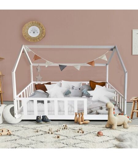 Lit cabane KIWI 90 x 190 cm + barrière de lit / BlancQui n'a jamais rêvé de dormir dans une cabane ? Avec le lit KIWI, on transforme la chambre en un lieu magique qui stimulera l'imaginaire de l'enfant. Sa structure à été conçue pour ressembler à une véritable petite maison aux allures minimalistes et scandinave : une jolie touche de décoration supplémentaire dans la chambre des enfants..• Avec sa barrière esthétique limitant les risques de chutes, le lit KIWI permettra à votre enfant de passer d'agréables nuits en toute sécurité.Points forts :- Montage facile et rapide- Robuste et durableCaractéristiques :- Age adapté : de 4 à 12 ans- Dimensions : l.196,4 x L.96,5x H.140,5- Structure en pin- Finition : Blanc- Barrière: en pin massif hauteur 36 cm, Finition: Blanc- Livré avec sommier à 13 lattes- Poids net : 24.3 kgPrécautions à prendre :* Hauteur maximale recommandée pour le matelas: 16 cm * NE CONVIENT PAS AUX ENFANTS DE MOINS DE 4 ANS.* Capacité charge maximale : 80 kgConditions ...