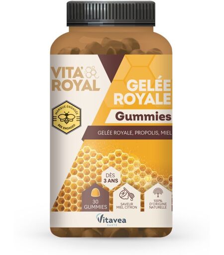 Complément alimentaire à utiliser dans le cadre d’une alimentation variée, équilibrée et d’un mode de vie sain.Vitavea Vita'Royal Gelée Royale 30 Gummies est un complément alimentaire à base de gelée royale, de propolis et de miel pour fortifier l'organisme en profondeur.La gelée royale est un ingrédient rare et précieux fabriqué par les abeilles, reconnue pour ses vertus nutritives.Valeurs nutritionnelles Pour 2 gummiesGelée royale200 mgMiel250 mgPropolis20 mgConseils d'utilisationÀ partir de 3 ans : Prendre 1 gomme par jour.Adultes : Prendre 1 à 2 gommes par jour.Précautions d'emploiNe pas dépasser la dose recommandée.Ne convient pas aux personnes ayant un terrain atopique.À consommer dans le cadre d'une alimentation variée et équilibrée et d'un mode de vie sain.À conserver dans un endroit frais et sec.À garder hors de portée des enfants.Poids net30 gummiesAdresse du FabricantVITAVEAIRB - Laboratoires Nutrisanté85612 Montaigu - France ...