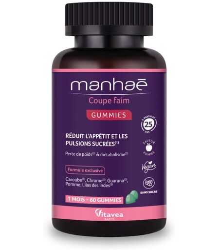 Complément alimentaire à utiliser dans le cadre d’une alimentation variée, équilibrée et d’un mode de vie sain.Sous forme de gummies, Manhaé Coupe Faim est un complément alimentaire conçu pour les femmes à partir de 25 ans. Il réduit l'appétit et les pulsions sucrées, participant ainsi à la perte de poids.BénéficesVeganSans sucreSaveur pommeProduit en FranceValeurs nutritionnelles Pour 2 gummiesExtrait de caroube*450 mgExtrait de pomme100 mgExtrait de guarana30 mgdont caféine3,30 mgExtrait de lilas des Indes24 mgChrome150 µg (375 % VNR**)Énergie26,18 kJ/6,26 kcalMatières grasses0,1 gdont acides gras saturés0,1 gGlucides4,92 gdont sucres0 gFibres0,12 gProtéines0 gSel0,028 gConseils d'utilisationManhaé Coupe Faim est un complément alimentaire réservé à la femme à partir de 25 ans. La dose conseillée est de 2 gummies à croquer par jour. N'oubliez pas de boire régulièrement pour optimiser l'efficacité de votre programme.Précautions d'emploiA consommer dans le cadre d'une alimentation variée, équilibrée et d'un mode de vie sain.Contient de la caféine (3,30 mg par dose journalière), déconseillé aux enfants et aux femmes enceintes.Une consommation excessive peut avoir des effets laxatifs.Ne pas dépasser la dose recommandée.A garder hors de portée des enfants.A conserver dans un endroit frais et sec (recommandé sous 25 °C). Éviter la lumière directe du soleil.Poids net60 gummiesAdresse du FabricantVITAVEAIRB - Laboratoires Nutrisanté85612 Montaigu - France ...