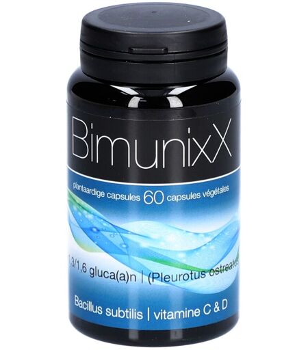 Complément alimentaire à utiliser dans le cadre d’une alimentation variée, équilibrée et d’un mode de vie sain.BIMUNIXX® Beta-glucane, vitamine C, D3 & probiotiques Défenses naturellesBIMUNIXX® est un complément alimentaire à base de vitamines C et D3, qui participent au fonctionnement normal du système immunitaire et aident à maintenir les défenses naturelles de l’organisme. Sa formule a été développée pour accompagner le système immunitaire aussi bien au début qu’au long cours.Ce complexe associe un bêta-1,3/1,6-glucane de haute pureté (95%) issu de la pleurote en huître (Pleurotus ostreatus), ainsi qu’une souche spécifique de bactérie sporulée, Bacillus subtilis.Le bêta-1,3/1,6-glucane extrait de la pleurote en huître fait l’objet de nombreuses recherches scientifiques, avec plus de 2200 publications publiées à ce jour.Molécule exclusive : Imunoglukan®, un ß-1,3/1,6-glucane breveté très pur (95%), le ß-glucane le plus efficaceHaut dosage Association exclusive de β-1,3/1,6-glucane et de Bacillus subtilisIngrédientsAgent de charge : cellulose microcristalline ; extrait de pleurote en huitre (Pleurotus ostreatus) ; acide L-ascorbique ; agent d'enrobage : hydroxypropylméthylcellulose ; Bacillus subtilis ; cholécalciférol ; humectant : sels de magnesium d'acide gras ; anti-agglomérant : dioxyde de silicium ; substances nutritives colorantes : concentré de pomme (Malus domestica) et extrait de spirulina (Arthrospira platensis).Données nutritionnellesPour 1 gélule : ß-1,3/1,6-glucane : 100 mg Bacillus subtilis : 1 million d'UFC Vitamine D : 25 µg (500% AR)Vitamine C : 100 mg (125% AR)AR : apport de référenceConseils d'utilisation1 gélule le matin, de préférence à jeunPrécautions d'emploi Conserver dans un lieu sec et frais (15-25°C). Tenir hors de portée des jeunes enfants. Ne pas dépasser la dose recommandée.Poids net60 gélulesFabricantixX PHARMABorsbeeksebrug 342600 AnversBelgique ...