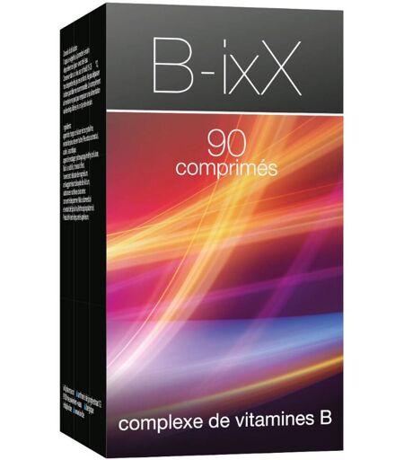 Complément alimentaire à utiliser dans le cadre d’une alimentation variée, équilibrée et d’un mode de vie sain.B ixX® Vitamines B Système nerveux FatigueB-IXX® est un complexe B puissant, richement dosé en vitamines B et en nutriments essentiels, conçu pour soutenir la production d’énergie, le métabolisme cellulaire et le bon fonctionnement du système nerveux.Il contient des formes hautement biodisponibles de vitamines B6 et B12, assurant une assimilation optimale.Les vitamines B1, B2, B3, B8, B9 et B12 contribuent au maintien d’un métabolisme énergétique normal et d’un système nerveux en bonne santé.Les vitamines B2, B3, B5, B6, B9 et B12 participent à la réduction de la fatigue et de l’épuisement.La formule est complétée par la choline, l’inositol et le PABA pour un soutien global et complet.Complexe très hautement dosé Vitamines sous forme biodisponiblesFormule exclusiveIngrédientsAgents de charge : carbonate de calcium et cellulose microcrystalline ; bitartrate de choline ; vitamine B3 ; inositol ; acide para-aminobenzoïque ; polyethylene gycol ; vitamine B1 ; vitamine B8 ; vitamine B5 ; anti-agglomérant : acide stéarique ; vitamine B2 ; agent d’enrobage : hydroxypropylméthylcellulose ; vitamine B6 (pyridoxal-5-phosphate) ; humectant : polyéthylène glycol ; vitamine B9 ; vitamine B12 (méthylcobalamine) ; arôme : vanille.Données nutritionnellesPour 1 comprimé : Vitamine B1 : 22 mg (2000% AR)Vitamine B2 : 14 mg (1000% AR)Vitamine B3 : 54 mg (337,5% AR)Vitamine B5 : 24 mg (400% AR)Vitamine B6 : 5,6 mg (400% AR) (pyridoxal-5-phosphate)Vitamine B12 : 1 mg (40000% AR) (méthylcobalamine)Vitamine B8 : 0,5 mg (1000% AR)Vitamine B9 : 0,5 mg (250% AR)Choline : 40 mg Inositol : 40 mg PABA : 40 mgConseils d'utilisation1 comprimé par jourPrécautions d'emploi Conserver dans un lieu sec et frais (15-25°C). Tenir hors de portée des jeunes enfants. Ne pas dépasser la dose recommandée.Poids net90 comprimésFabricantixX PHARMABorsbeeksebrug 342600 AnversBelgique ...