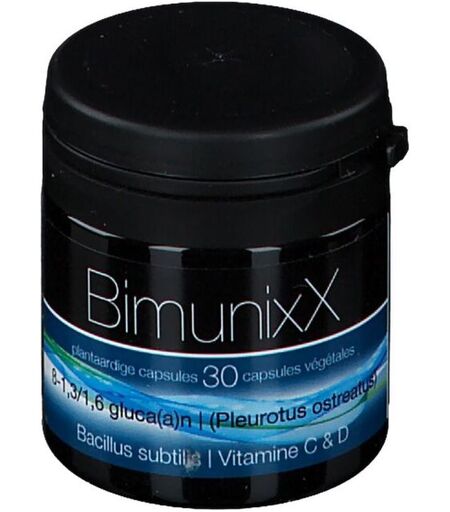 Complément alimentaire à utiliser dans le cadre d’une alimentation variée, équilibrée et d’un mode de vie sain.BIMUNIXX® Beta-glucane, vitamine C, D3 & probiotiques Défenses naturellesBIMUNIXX® est un complément alimentaire à base de vitamines C et D3, qui participent au fonctionnement normal du système immunitaire et aident à maintenir les défenses naturelles de l’organisme. Sa formule a été développée pour accompagner le système immunitaire aussi bien au début qu’au long cours.Ce complexe associe un bêta-1,3/1,6-glucane de haute pureté (95%) issu de la pleurote en huître (Pleurotus ostreatus), ainsi qu’une souche spécifique de bactérie sporulée, Bacillus subtilis.Le bêta-1,3/1,6-glucane extrait de la pleurote en huître fait l’objet de nombreuses recherches scientifiques, avec plus de 2200 publications publiées à ce jour.Molécule exclusive : Imunoglukan®, un ß-1,3/1,6-glucane breveté très pur (95%), le ß-glucane le plus efficaceHaut dosage Association exclusive de β-1,3/1,6-glucane et de Bacillus subtilisIngrédientsAgent de charge : cellulose microcristalline ; extrait de pleurote en huitre (Pleurotus ostreatus) ; acide L-ascorbique ; agent d'enrobage : hydroxypropylméthylcellulose ; Bacillus subtilis ; cholécalciférol ; humectant : sels de magnesium d'acide gras ; anti-agglomérant : dioxyde de silicium ; substances nutritives colorantes : concentré de pomme (Malus domestica) et extrait de spirulina (Arthrospira platensis).Données nutritionnellesPour 1 gélule : ß-1,3/1,6-glucane : 100 mg Bacillus subtilis : 1 million d'UFC Vitamine D : 25 µg (500% AR)Vitamine C : 100 mg (125% AR)AR : apport de référenceConseils d'utilisation1 gélule le matin, de préférence à jeunPrécautions d'emploi Conserver dans un lieu sec et frais (15-25°C). Tenir hors de portée des jeunes enfants. Ne pas dépasser la dose recommandée.Poids net30 capsules végétalesFabricantixX PHARMABorsbeeksebrug 342600 AnversBelgique ...