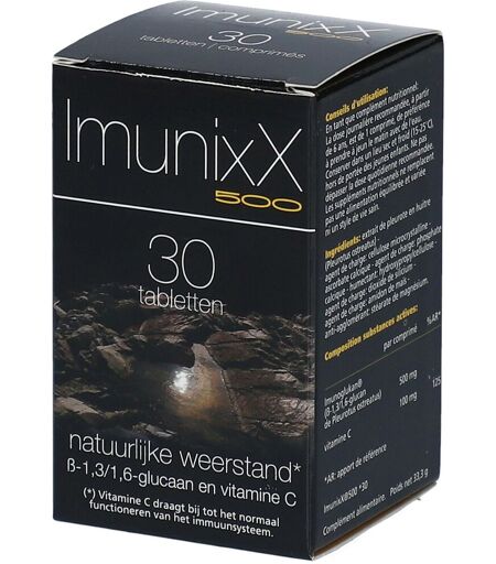Complément alimentaire à utiliser dans le cadre d’une alimentation variée, équilibrée et d’un mode de vie sain.IMUNIXX 500® très haut dosage en beta glucane & Vitamine C ImmunitéIMUNIXX 500® associe un dosage élevé (500 mg) d’Imunoglukan®, un ß-1,3/1,6-glucane breveté et hautement purifié (95%), à la vitamine C.La vitamine C contribue au fonctionnement normal du système immunitaire et aide à protéger les cellules contre le stress oxydatif.Ce complément peut être utilisé aussi bien lors de périodes exigeantes pour l’organisme que dans le cadre d’un soutien prolongé du système immunitaire.Très haute dose en ß-1,3/1,6-glucaneMolécule exclusive : Imunoglukan®, un ß-1,3/1,6-glucane breveté très pur (95%), le ß-glucane le plus efficaceSoutien rapideIngrédientsExtrait de pleurote en huitre (Pleurotus ostreatus); agent de charge : cellulose microcristalline ; ascorbate calcique; agent de charge : phosphate calcique ; humectant : hydroxypropylcellulose ; agent de charge : silice; agent de charge : amidon de maïs ; anti-agglomérant : sels de magnésium d'acides gras.Données nutritionnellesPour 1 comprimé :β-1,3/1,6-glucane : 500 mgVitamine C : 100 mg (125% AR) AR : apport de référenceConseils d'utilisation1 comprimé le matin, de préférence à jeunÀ partir de 6 ansPrécautions d'emploi Conserver dans un lieu sec et frais (15-25°C). Tenir hors de portée des jeunes enfants. Ne pas dépasser la dose recommandée.Une utilisation excessive peut avoir un effet laxatif.Poids net30 comprimés = 33,3 gFabricantixX PHARMABorsbeeksebrug 342600 AnversBelgique ...