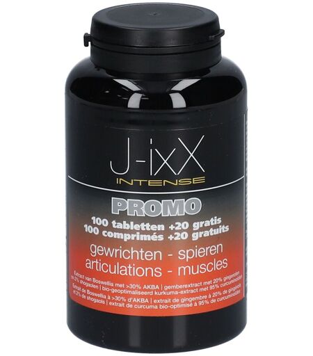 Complément alimentaire à utiliser dans le cadre d’une alimentation variée, équilibrée et d’un mode de vie sain.J-IXX INTENSE® Soutien articulations, musclesJ-IXX INTENSE® est un complément alimentaire à la formulation exclusive, spécialement conçu pour soutenir la mobilité et contribuer au confort articulaire et musculaire au quotidien.Sa composition associe plusieurs actifs végétaux et nutriments :Boswellia serrata : extrait hautement dosé et standardisé à 30% en AKBA (acide 3-O-acétyl-11-céto-β-boswellique), l’acide boswellique le plus étudié pour son action sur la mobilité et la souplesse.Curcuma bio-optimisé : naturellement riche en curcuminoïdes, il contribue au maintien de la santé articulaire, à la protection des cellules contre le stress oxydatif et au soutien du système musculo-squelettique.Gingembre : traditionnellement utilisé pour favoriser la mobilité articulaire et aider à réduire la sensation de raideur, notamment au lever.Vitamine C : participe à la formation normale de collagène, essentielle pour assurer la fonction normale des cartilages.Vitamine D : contribue au maintien d’une ossature normale et soutient la fonction musculaire.Grâce à cette synergie d’ingrédients, J-IXX INTENSE® est une solution adaptée pour les personnes recherchant confort, souplesse et mobilité articulaire, tout en soutenant leurs muscles et leurs os de manière naturelle.Association d'actif au dosage des études scientifiquesExtrait unique standardisé à 30% en AKBA, l'acide boswellique le plus actif.Formule exclusive associant l'AKBA, les gingérols et les curcuminoïdesIngrédientsExtrait de racine de curcuma (Curcuma longa) ; extrait de résine de boswellia (Boswellia serrata) ; agent de charge: phospohate dicalcique ; agent de charge : silice ; agent de charge : cellulose microcrystalline ; anti-agglomérant: sels de magnésium d'acides gras ; agent de charge : hydroxypropylcellulose ; extrait de rhizome de gingembre (Zingiber officinale) ; humectant : hydroxypropylmethylcellulose ; agent de charge : carbonate de calcium ; anti-agglomérant : croscarmellose de sodium ; vitamine C ; agent de charge : amidon de riz ; vitamine D ; humectant : polyéthylène glycol , glycérol ; colorant : oxyde de fer ; anti-agglomérant : talc ; colorant : rouge carmin ; arôme : vanille.Données nutritionnellesPour 3 comprimés :Boswellia serrata : 510 mg dont AKBA : 153 mgCurcuma : 1200 mg dont curcuminoïdes : 1140 mgGingembre : 100 mg dont gingérols : 20 mgVitamine C : 48 mgVitamine D : 30 µg (1200 lE/Ul %AR)AR : apport de référenceConseils d'utilisation3 comprimés par jour, de préference au cours d'un repas À partir de 12 ansPrécautions d'emploi Conserver dans un lieu sec et frais (15-25°C). Tenir hors de portée des jeunes enfants. Ne pas dépasser la dose recommandée.Déconseillé aux femmes enceintes.Consultez votre médecin ou notre service pharmaceutique en cas d’usage concomitant d’anticoagulants.Poids net100 + 20 comprimésFabricantixX PHARMABorsbeeksebrug 342600 AnversBelgique ...
