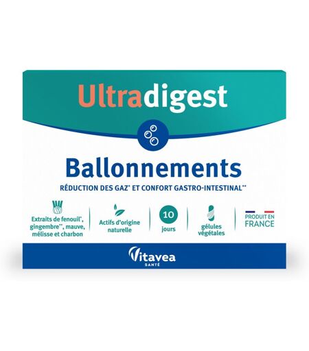 Complément alimentaire à utiliser dans le cadre d’une alimentation variée, équilibrée et d’un mode de vie sain.Ultradigest Ballonnements VITAVEA est la réponse naturelle pour réduire les gaz et soutenir le confort gastro-intestinal.Ultradigest Ballonnements est un complément alimentaire apportant une association d'actifs permettant de réduire les ballonnements.IngrédientsCharbon ; gélule d'origine végétale (dérivé de cellulose) ; extrait de mauve (Malva sylvestris) ; extrait de fenouil doux (Foeniculum vulgare) ; extrait de mélisse (Melissa officinalis) ; extrait de gingembre (Zingiber officinale) ; anti-agglomérant : sels de magnésium d'acides gras.Valeurs nutritionnelles Pour 3 gélulesCharbon400 mgExtrait de mauve150 mgExtrait de fenouil150 mgExtrait de mélisse50 mgExtrait de gingembre30 mgConseils d'utilisation3 gélules par jour à avaler avec un verre d'eau, à distance des prises médicamenteuses.Précautions d'emploiNe pas dépasser la dose journalière recommandée. À consommer dans le cadre d'une alimentation variée et équilibrée et d'un mode de vie sain. Ne convient pas aux enfants de moins de 12 ans. À garder hors de portée des enfants.Poids net30 gélulesAdresse du FabricantVitaveaParc d'Activité Sud85600 Boufféré ...