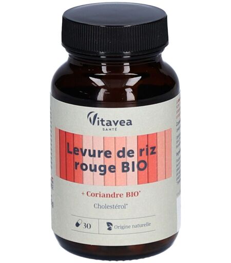 Complément alimentaire à utiliser dans le cadre d’une alimentation variée, équilibrée et d’un mode de vie sain.Vitavea Santé Nutri’sentiels Levure de riz rouge & coriandre bio est un complément alimentaire à base de levure de riz rouge et de coriandre issues de l’agriculture biologique. La levure de riz rouge est naturellement riche en monacolines, tandis que la coriandre soutient la fonction cardiaque, aide à la digestion des graisses et contribue au maintien d’un taux de cholestérol normal.IngrédientsPoudre de coriandre bio (Coriandrum sativum), levure de riz rouge bio (Monascus purpureus), capsule végétale (dérivé de cellulose), anti-agglomérant : carbonate de magnésium, amidon de riz bio.Valeurs nutritionnelles Pour 1 capsule Poudre de coriandre bio100 mg Levure de riz rouge bio96 mg dont monacolines totales2,9 mg Conseils d'utilisationPrendre 1 capsule par jour avec un grand verre d’eau.Précautions d'emploiNe pas dépasser la dose recommandée. À consommer dans le cadre d’un régime alimentaire varié et équilibré et d’un mode de vie sain. Tenir hors de portée des enfants. Ne pas consommer plus de 2,9 mg de monacolines par jour. Ne pas utiliser chez les femmes enceintes ou allaitantes, les enfants de moins de 18 ans et les adultes de plus de 70 ans. Ne pas associer à d'autres produits contenant de la levure de riz rouge. En cas de problème de santé, consulter un médecin.Poids net30 capsules = 11,25 gAdresse du FabricantVitaveaParc d'Activité Sud85600 Boufféré ...