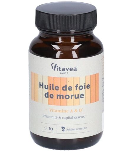 Complément alimentaire à utiliser dans le cadre d’une alimentation variée, équilibrée et d’un mode de vie sain.Vitavea Huile de foie de morue est un complément alimentaire à base d’huile de poisson naturellement riche en vitamines A et D ainsi qu’en oméga-3 (EPA et DHA). Il aide à renforcer les défenses immunitaires et à maintenir le capital osseux. Les vitamines A et D contribuent au fonctionnement normal du système immunitaire.IngrédientsHuile de foie de morue (huile de POISSON, vitamines A et D), antioxydant : tocophérols, capsule (gélatine), stabilisant : glycérol.Allergènes : Poisson.Valeurs nutritionnelles Pour 1 capsule% VNR* Huile de foie de morue560 mg- dont DHA33,6 mg- dont EPA39,2 mg- Vitamine A168 µg21% Vitamine D14 µg28% *VNR : Valeurs Nutritionnelles de RéférenceConseils d'utilisationPrendre 1 capsule par jour, à avaler avec un grand verre d’eau.Précautions d'emploiDéconseillé aux femmes enceintes ou désireuses de l’être. Déconseillé aux femmes ménopausées. Ne pas dépasser la dose journalière recommandée. À consommer dans le cadre d’une alimentation variée, équilibrée et d’un mode de vie sain. Tenir hors de portée des enfants.Poids net30 capsules = 23,1 gAdresse du FabricantVitaveaIRB - Laboratoires Nutrisanté85612 Montaigu – France ...
