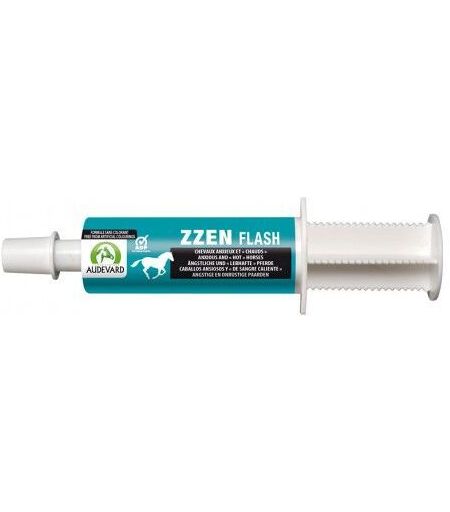 Cheval anxieux et chaudCertaines situations inhabituelles comme le transport, une compétition ou un entraînement, peuvent stresser certains chevaux. Dans ces situations, les besoins nutritionnels du cheval augmentent. Zzen Flash apporte ce soutien nutritionnel à votre cheval. Il contient du Tryptophane et du magnésium que les chevaux anxieux consomment de façon accrue. Cette formule est arômatisée à l'abricot/pêche.Programme antidopageAudevard a mis en place un programme de lutte contre le risque de dopage : Anti-doping Program. Ce logo garantit que le produit ne contient pas de substance dopante qui pourrait rendre votre cheval positif lors d'un contrôle. Les produits sont analysés par le Laboratoire des Courses Hippiques (LCH).Mode d'emploi1 heure avant le transport ou toute autre situation inhabituelle, videz une seringue dans la bouche du cheval. Le produit a un effet pendant 3 à 8 heures.Si nécessaire, il est possible de donner une seringue la veille au soir.Pour les chevaux stressés sur de longues périodes, utilisez Zzen Solution.CompositionChlorure de magnésium, monopropylène glycol, racine d'Angelica archangelica. Additifs (par litre) : 2b - Substances aromatiques : Extrait de stevia (CoE 552) 3000 mg ; 3cn - Acides aminés : 3.4.1 tryptophane techniquement pur 166 668 mg. Technologiques : arôme abricot/pêche 5100 mg ...